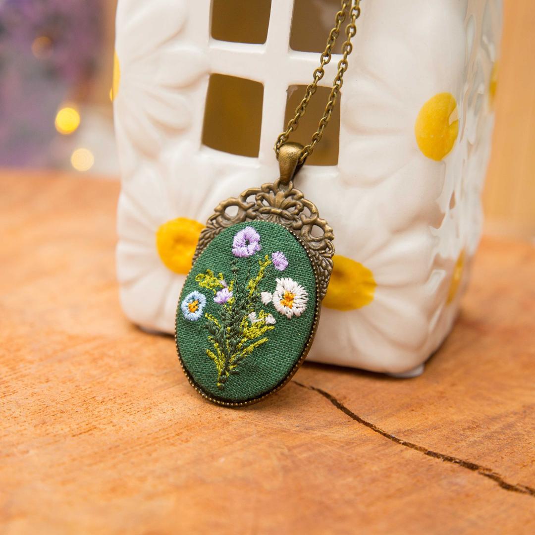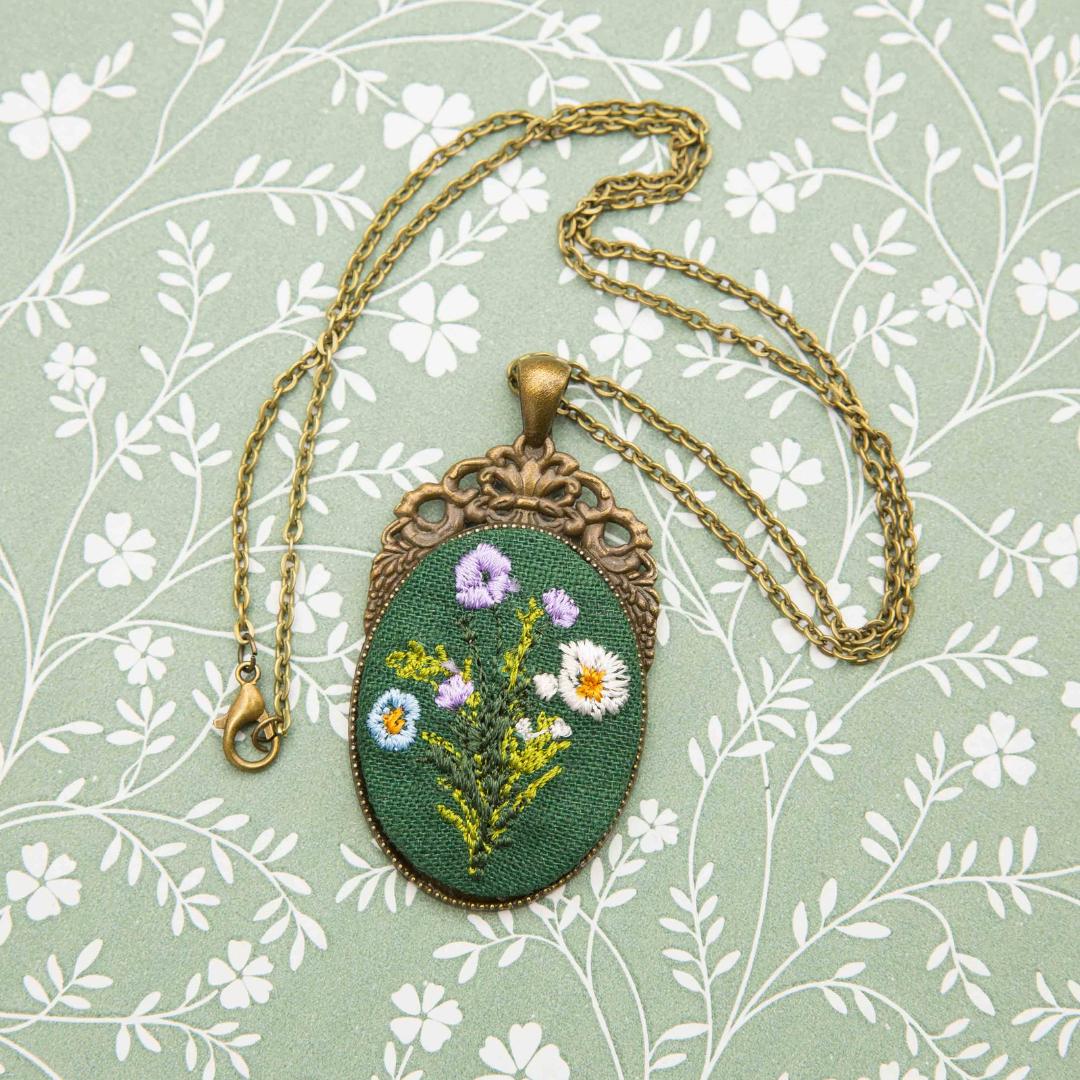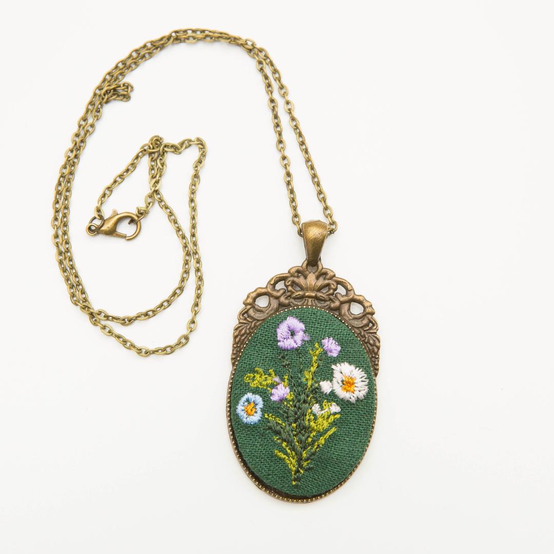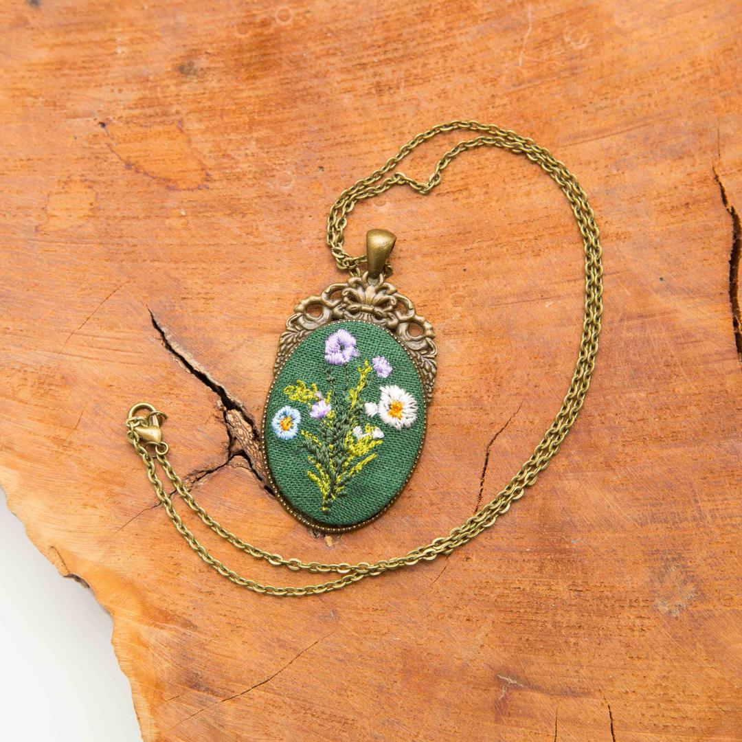 Haftowany wisiorek w metalowej oprawie. Haft przedstawia bukiet kwiatów na zielonym tle.