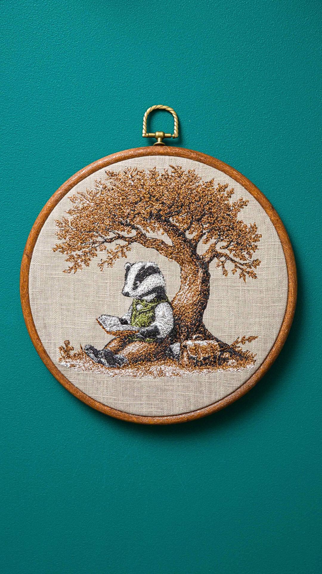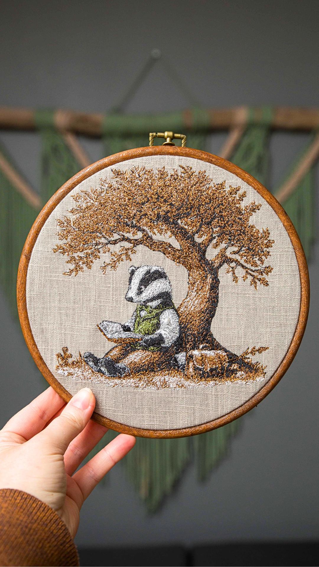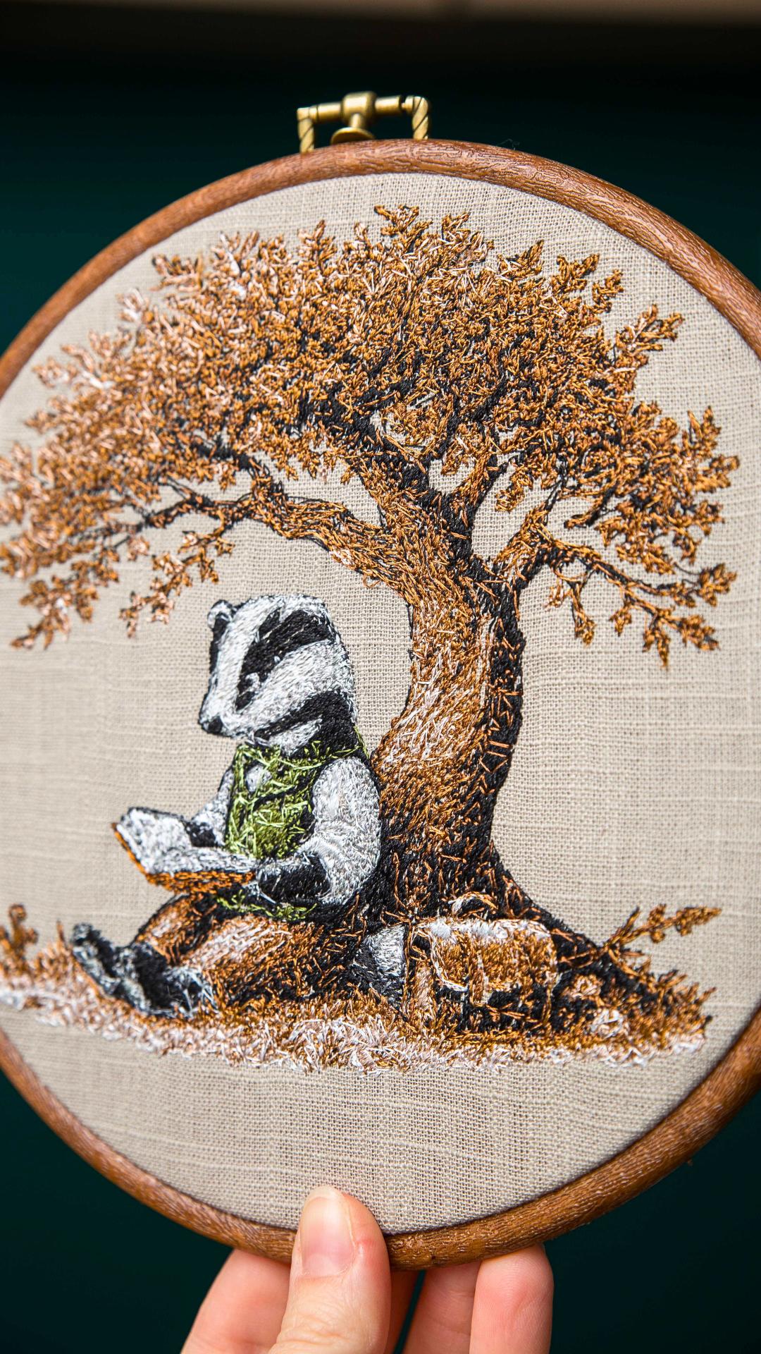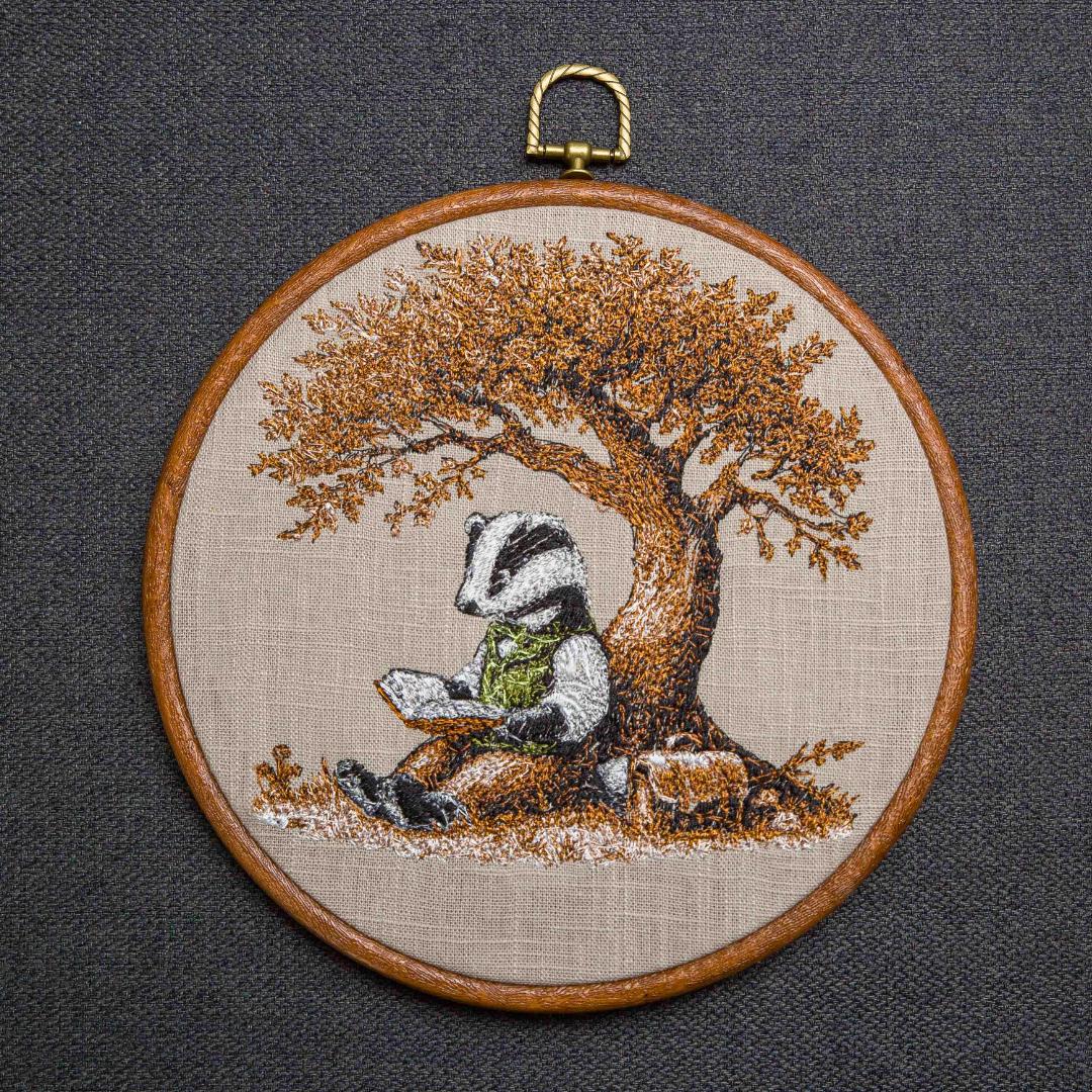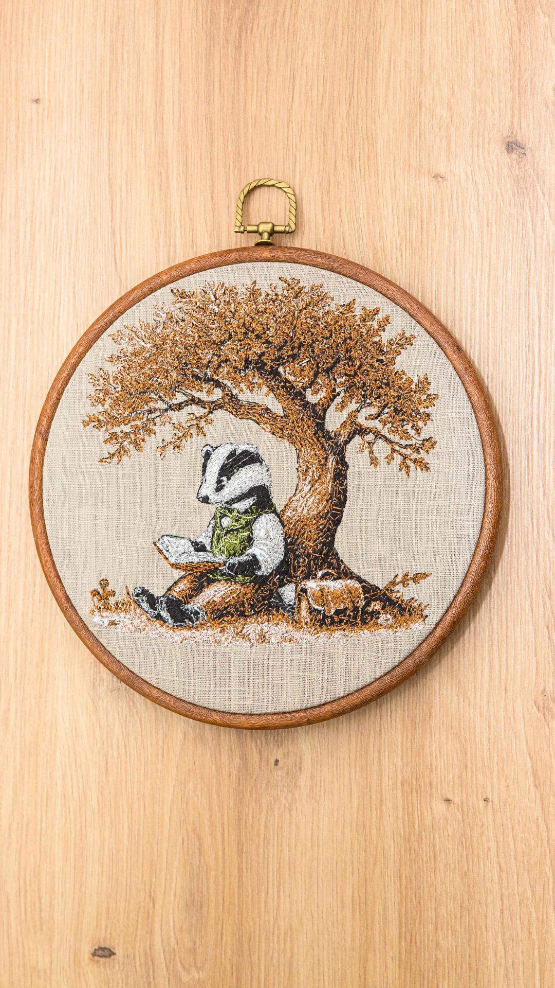 Haft przedstawia personifikowaną postać Borsuka czytającego książkę w cieniu drzewa. Haft w drewnianym tamborku lub oprawie vintage. Średnica 20 cm. Materiał bawełniany, nici hafciarskie.