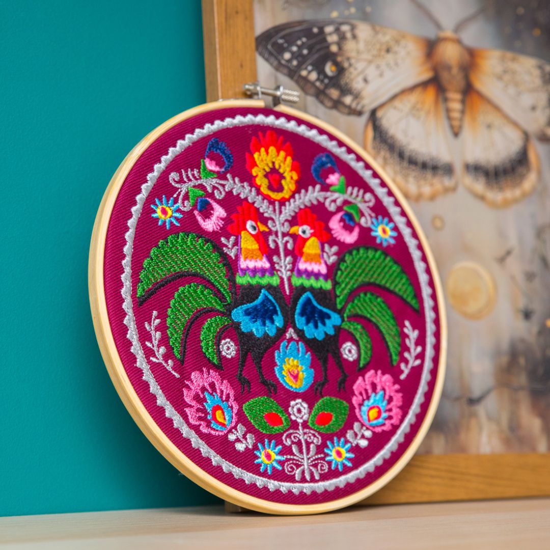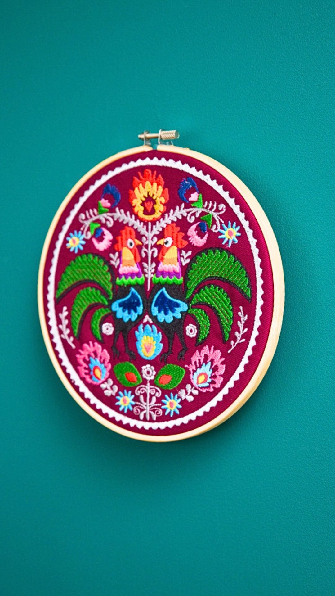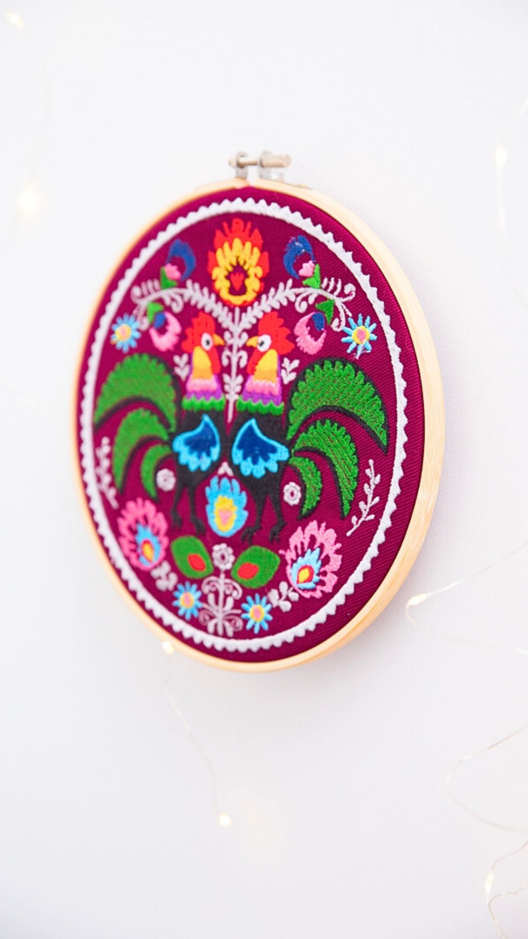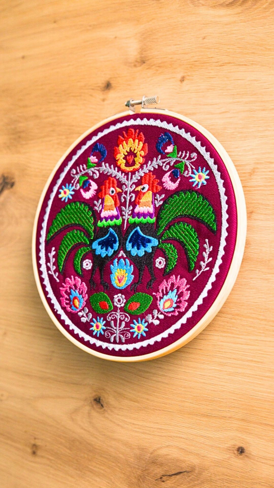 Koguty łowickie – bordo, haft w tamborku 20 cm
