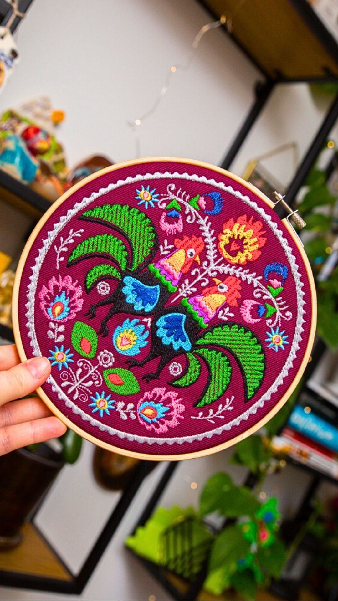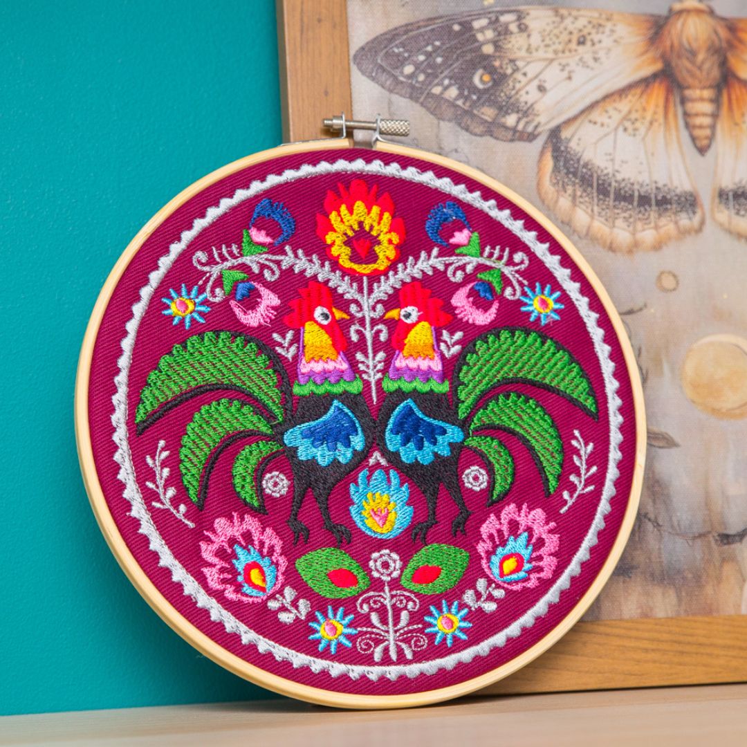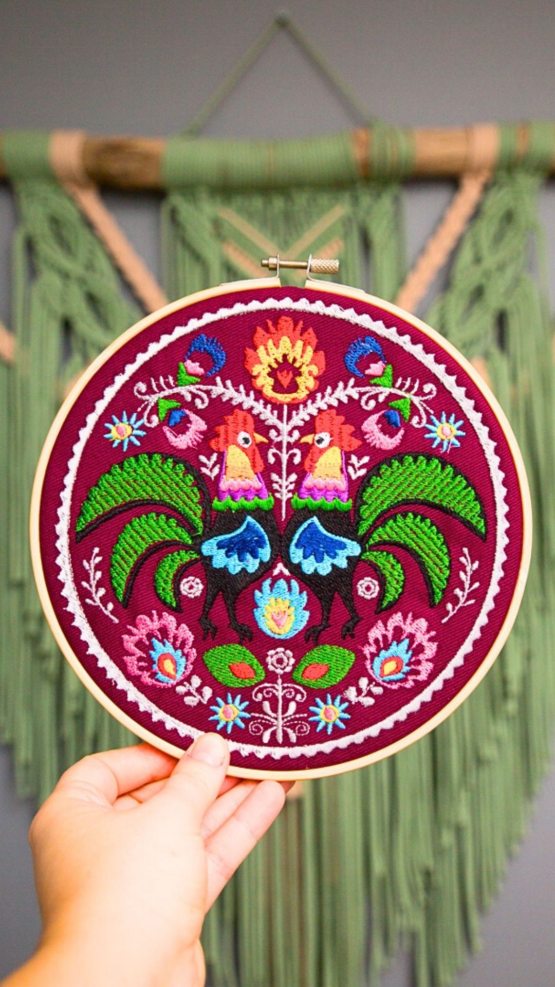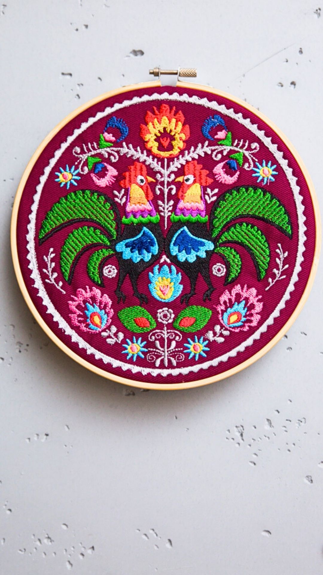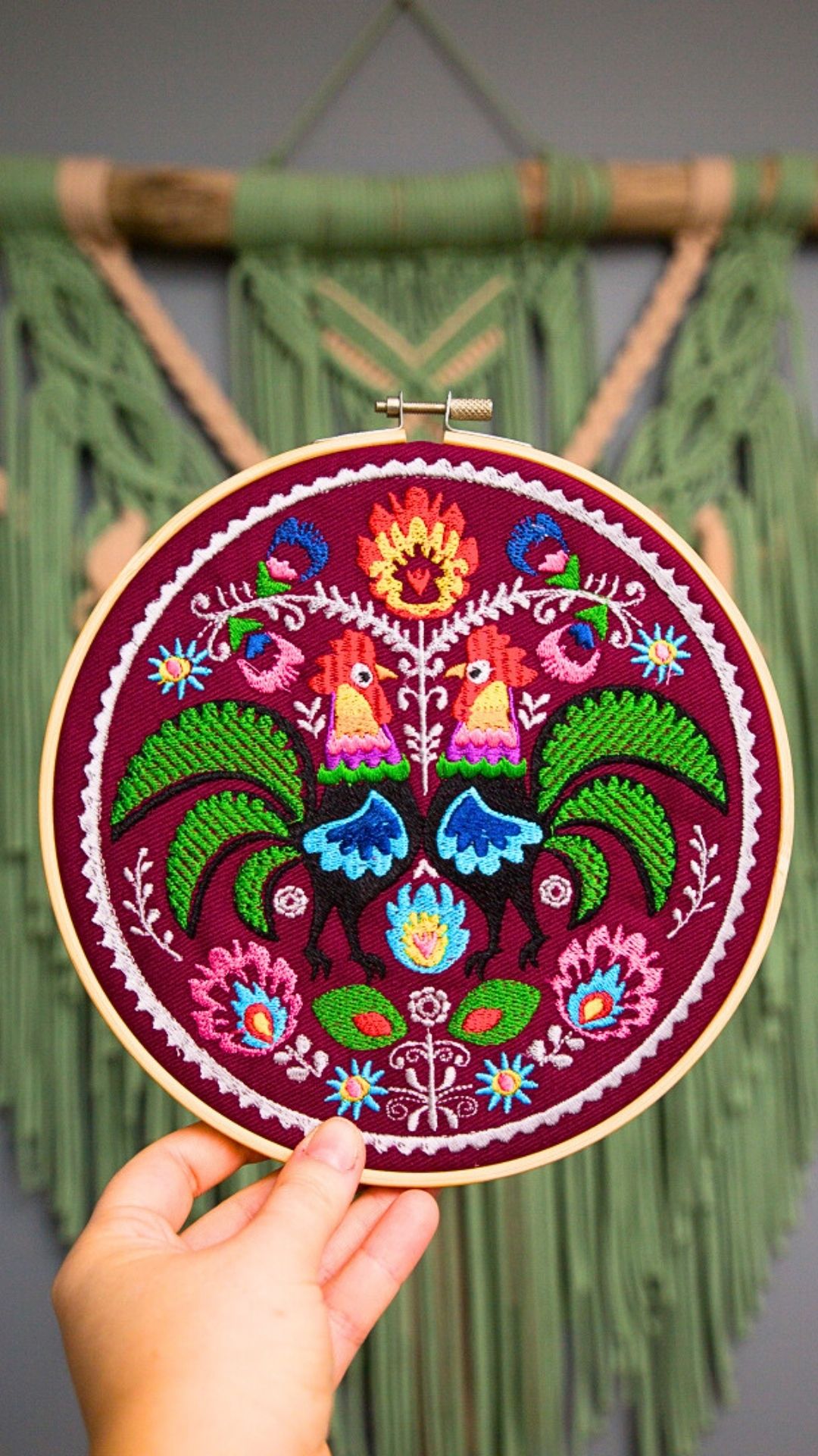 Koguty łowickie – bordo, haft w tamborku 20 cm