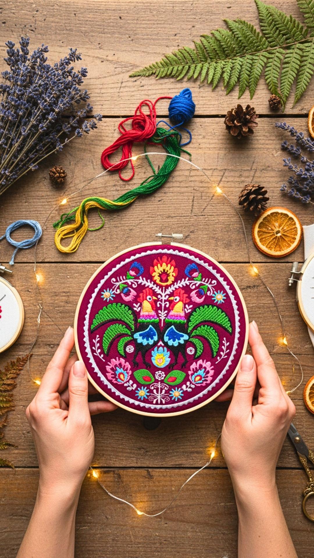 Haft w drewnianym tamborku. Średnica 20 cm. Materiał bawełniany, nici hafciarskie.