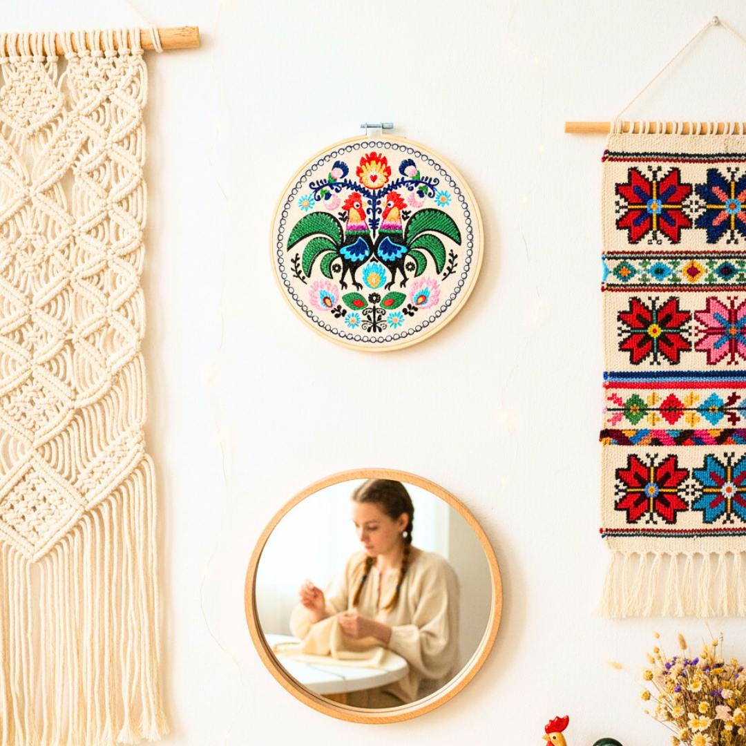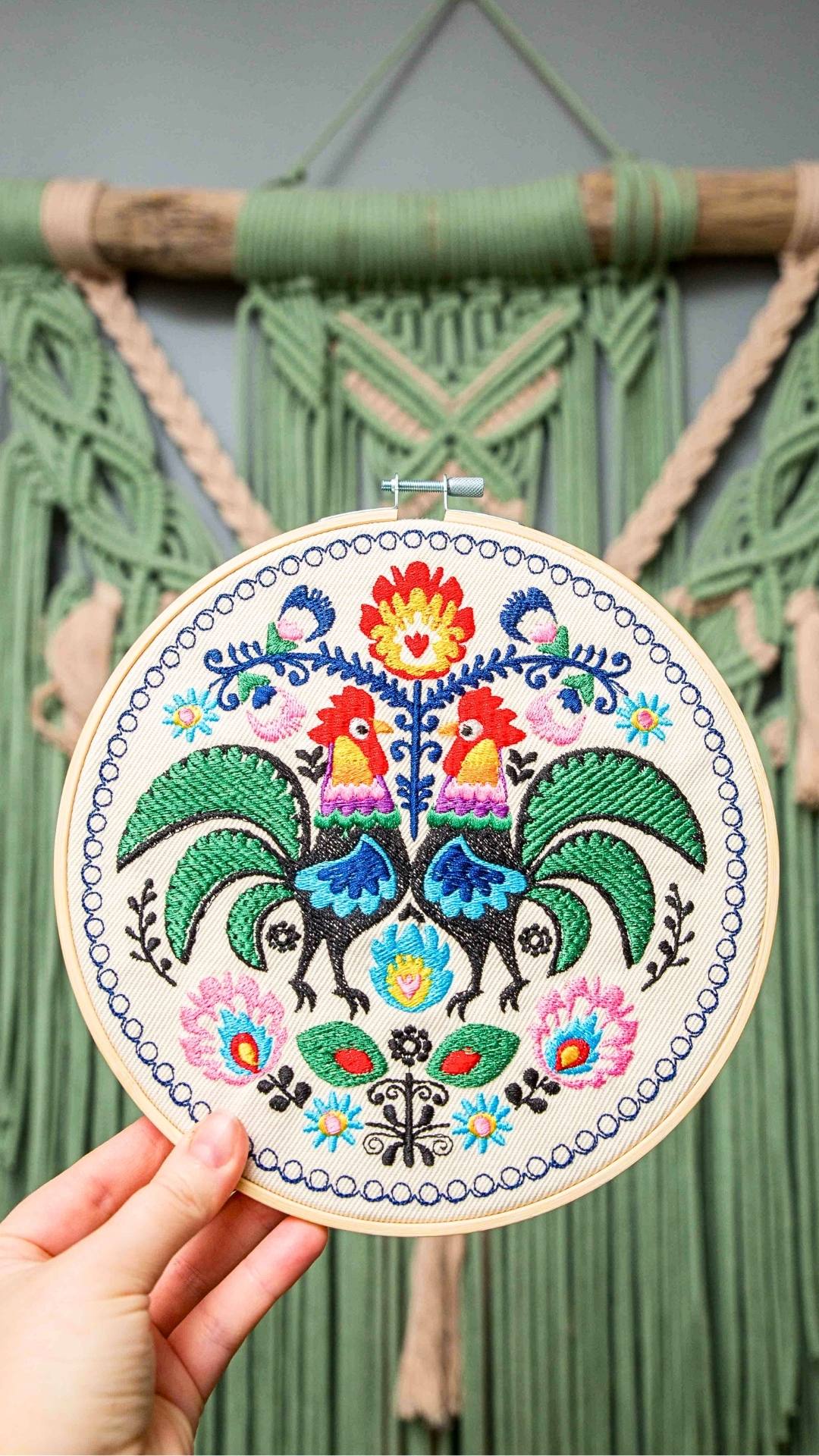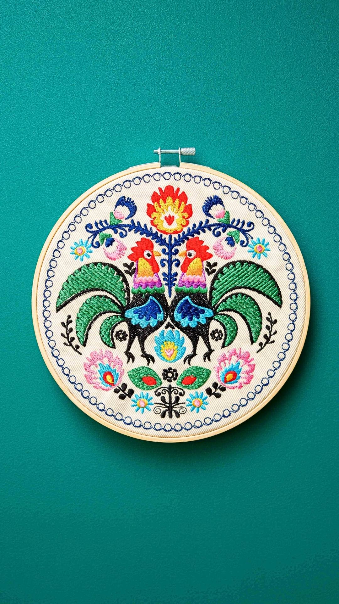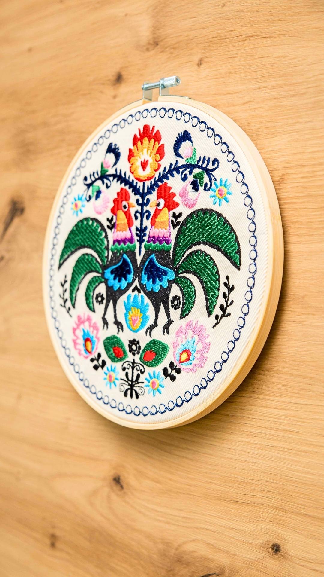 Cudowne, barwne, misternie utkane koguty łowickie. Udekorują Twój dom nadając mu odrobinę regionalnego, polskiego wzornictwa. Haft inspirowany łowickimi wzorami folklorystycznymi. Charakteryzuje się bogatą, żywą kolorystyką. Ozdoba cudownie prezentuje się w towarzystwie roślin oraz innych ozdób takich jak obrazy, makramy, tkane makatki, akcenty folklorystyczne. Jest bardzo oryginalną dekoracją, przyciągającą uwagę.
