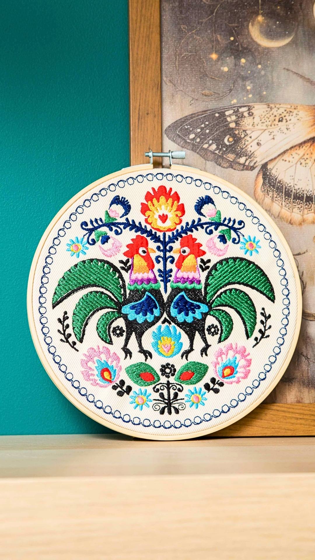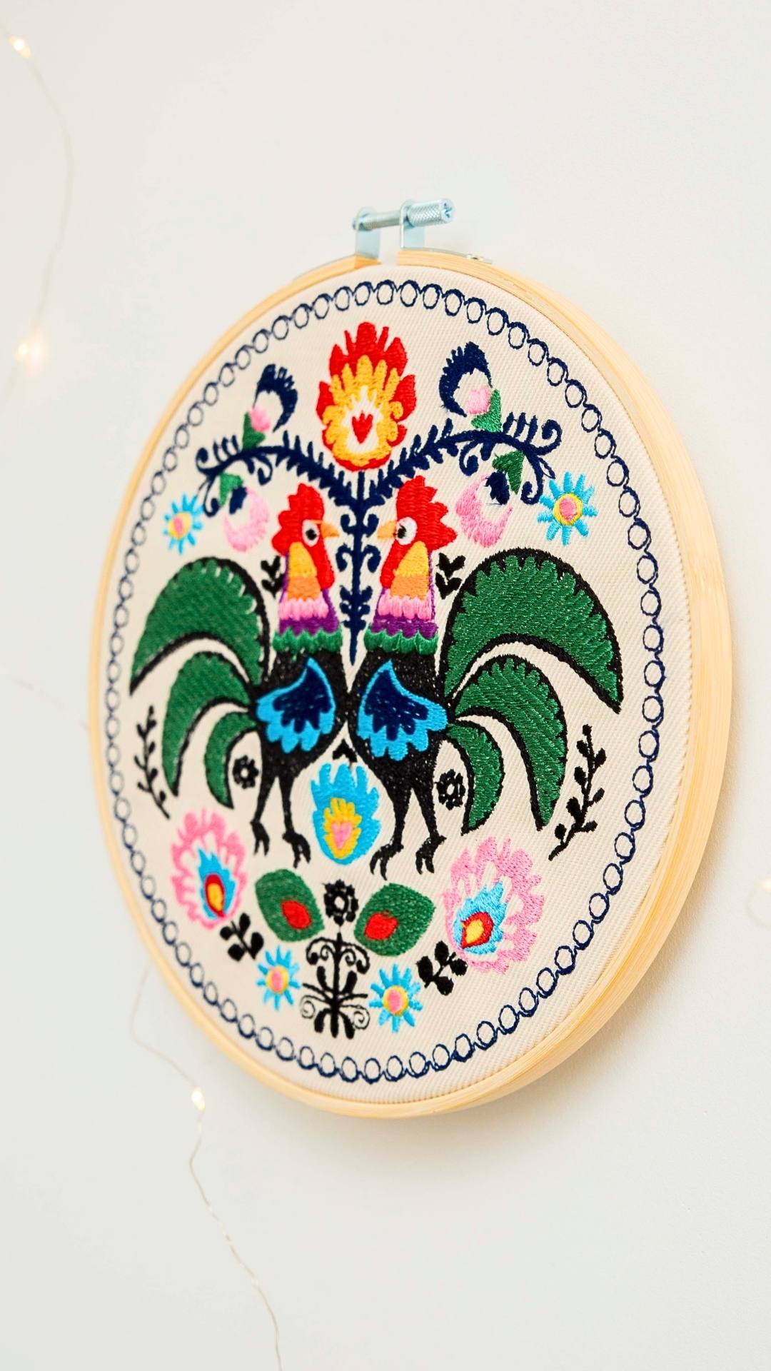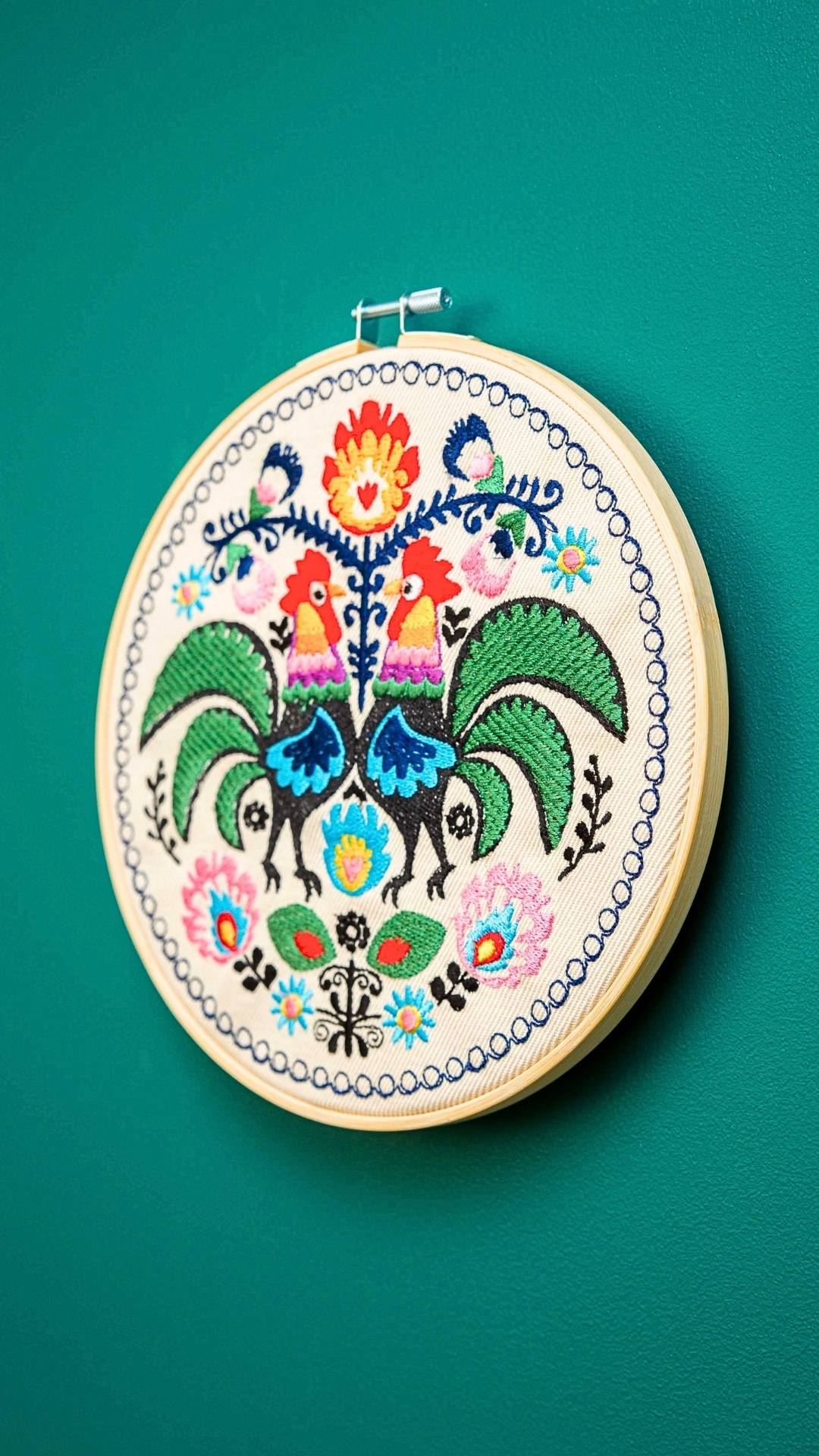 Cudowne, barwne, misternie utkane koguty łowickie. Udekorują Twój dom nadając mu odrobinę regionalnego, polskiego wzornictwa. Haft inspirowany łowickimi wzorami folklorystycznymi. Charakteryzuje się bogatą, żywą kolorystyką. Ozdoba cudownie prezentuje się w towarzystwie roślin oraz innych ozdób takich jak obrazy, makramy, tkane makatki, akcenty folklorystyczne. Jest bardzo oryginalną dekoracją, przyciągającą uwagę.