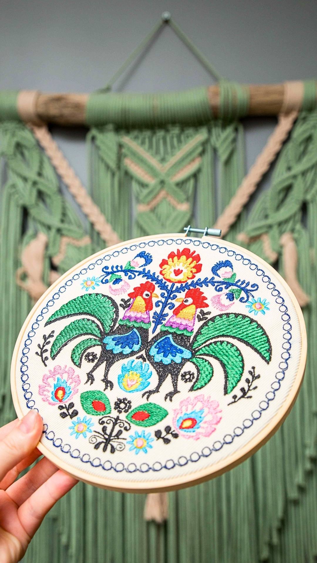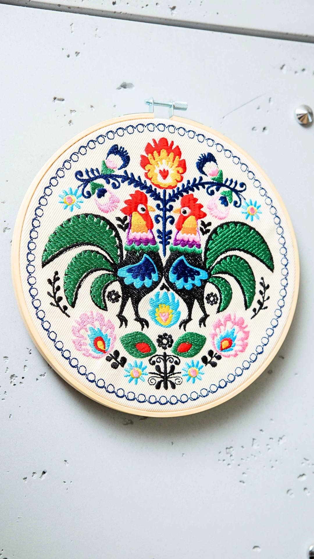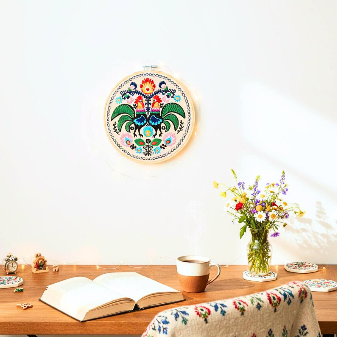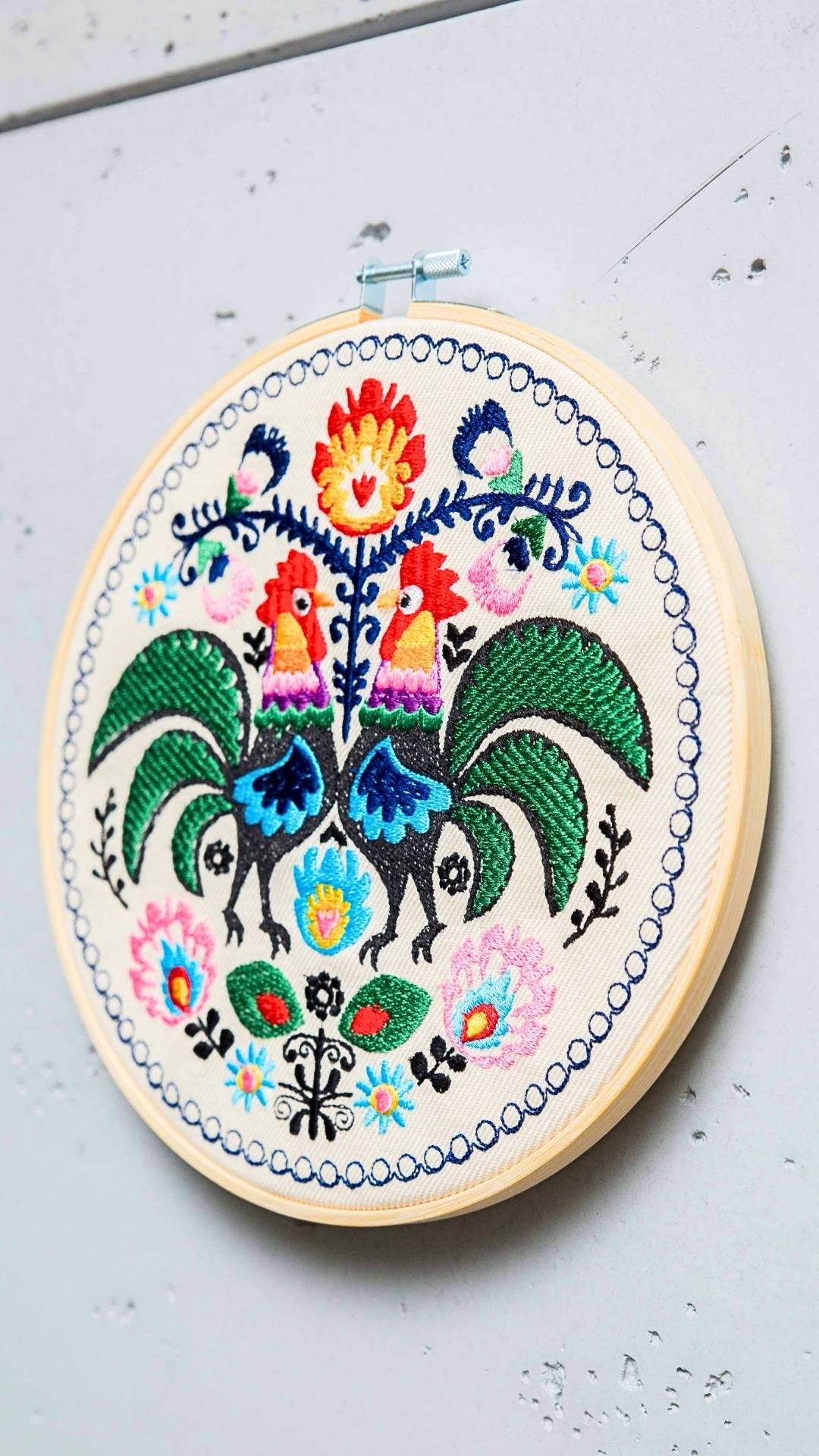 Cudowne, barwne, misternie utkane koguty łowickie. Udekorują Twój dom nadając mu odrobinę regionalnego, polskiego wzornictwa. Haft inspirowany łowickimi wzorami folklorystycznymi. Charakteryzuje się bogatą, żywą kolorystyką. Ozdoba cudownie prezentuje się w towarzystwie roślin oraz innych ozdób takich jak obrazy, makramy, tkane makatki, akcenty folklorystyczne. Jest bardzo oryginalną dekoracją, przyciągającą uwagę.