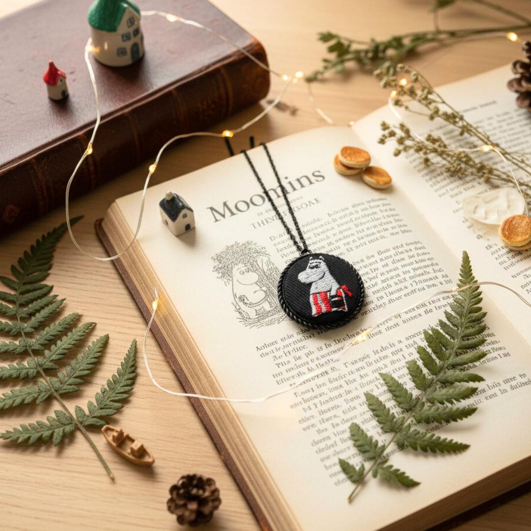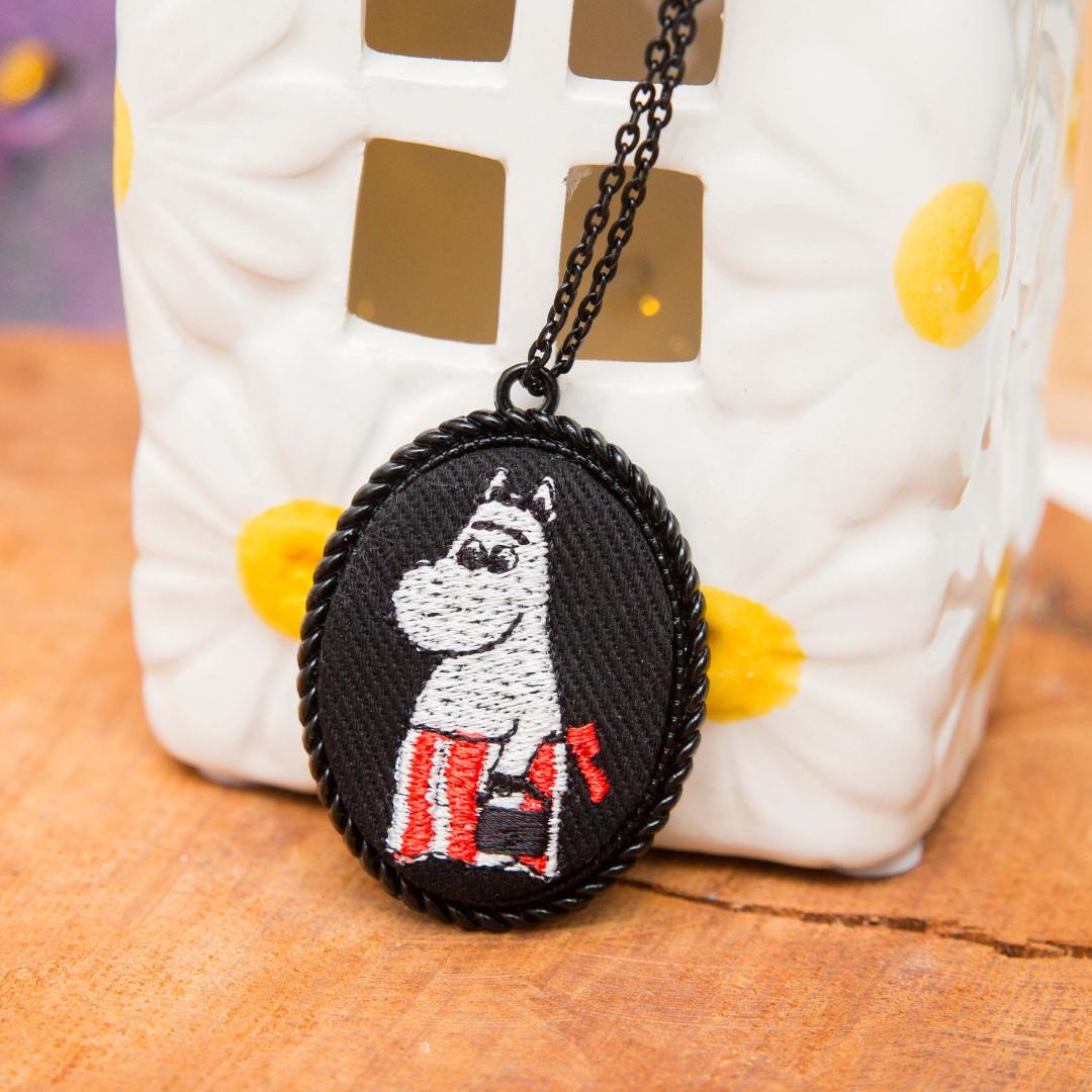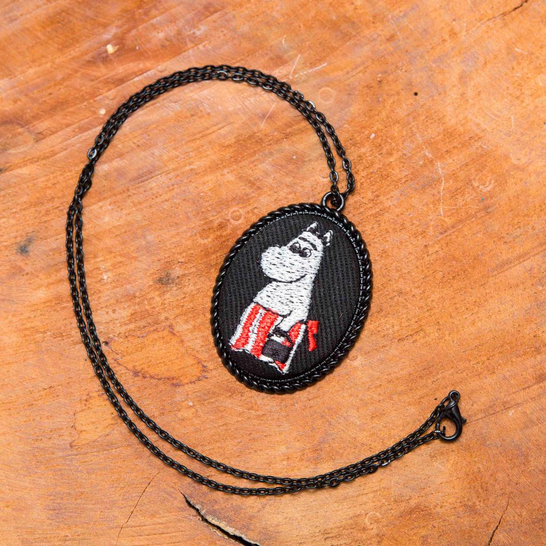 Haftowany wisiorek w metalowej oprawie. Haft inspirowany kultową bajką „Muminki” przedstawia Mamusię Muminka na czarnym tle. To amulet szczęścia, który możesz podarować sobie lub życzliwej Ci osobie <3
