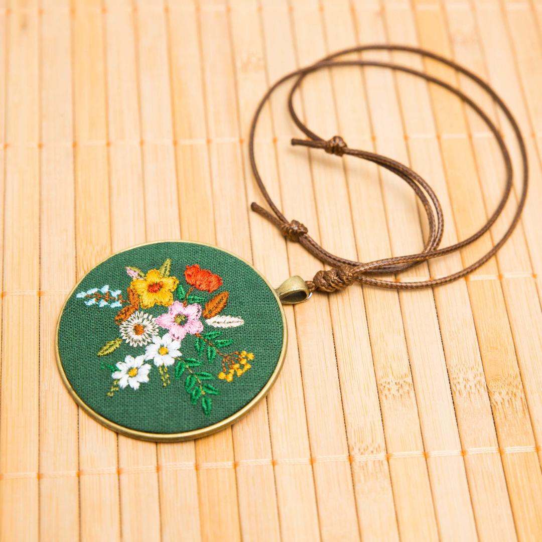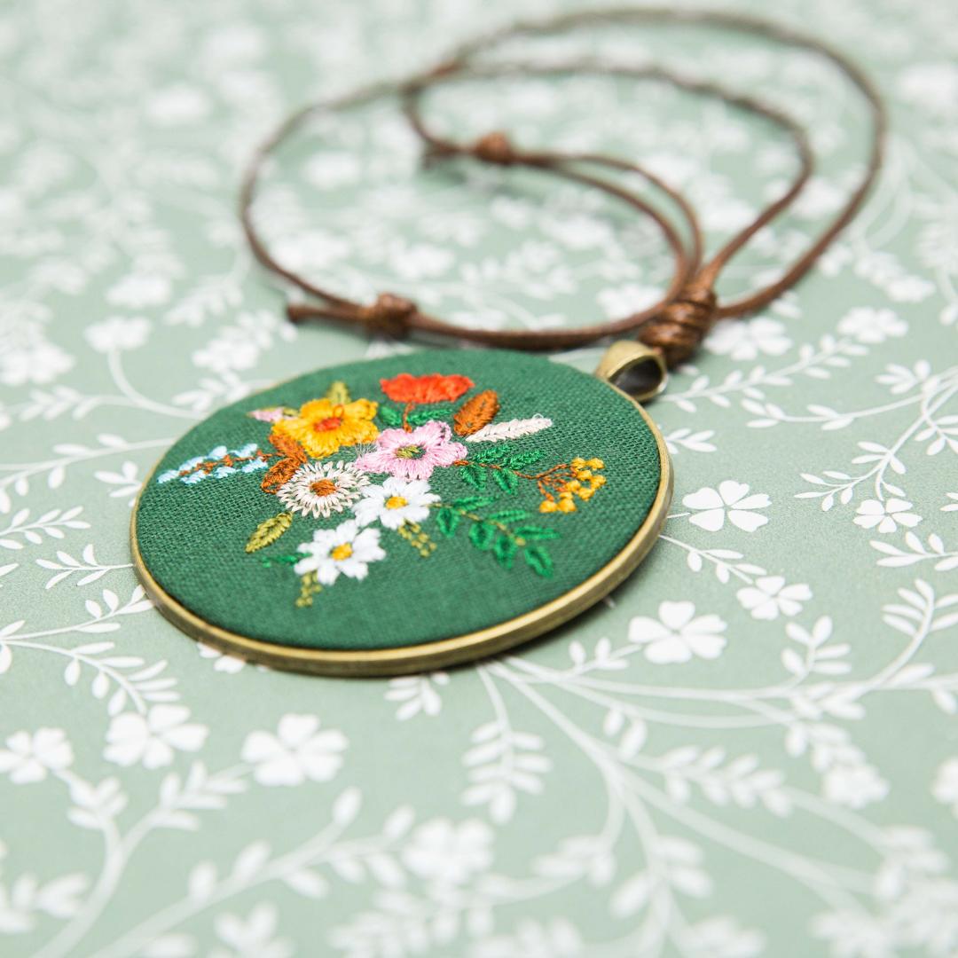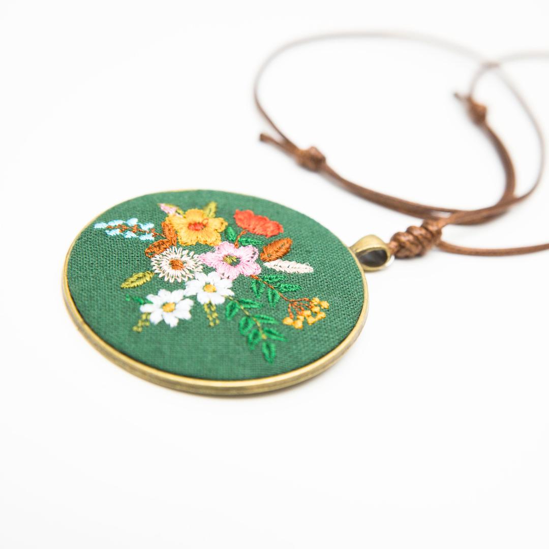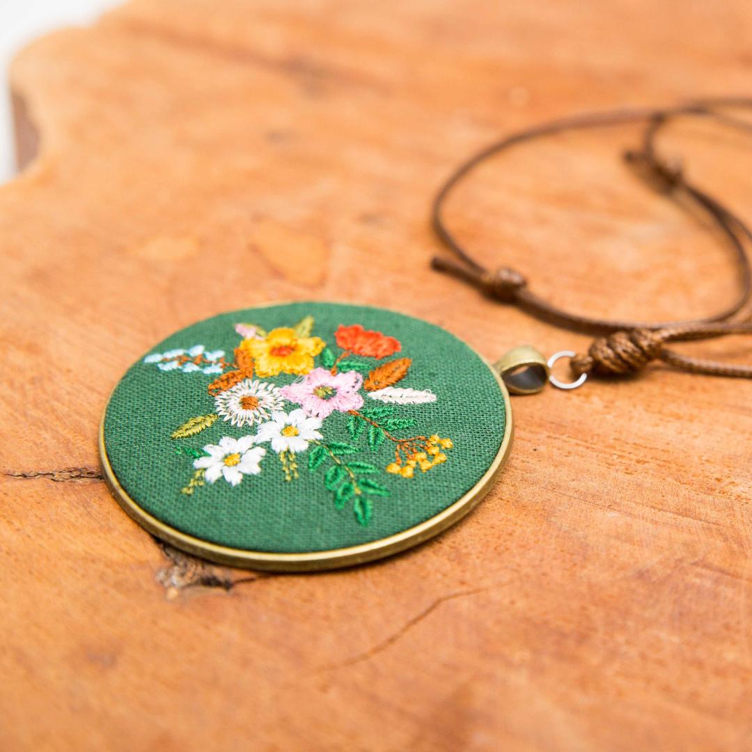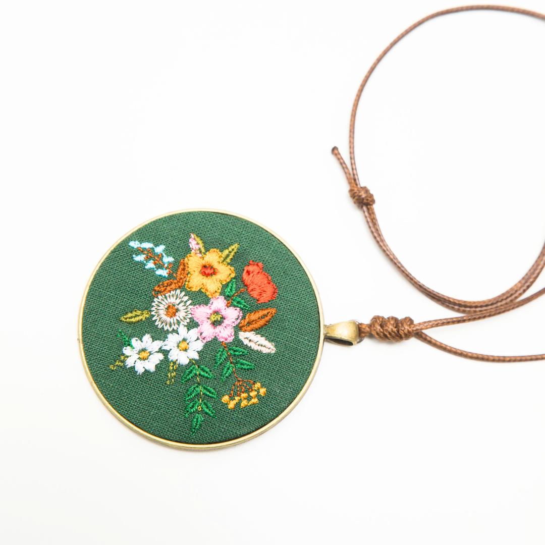 Haftowany wisiorek w metalowej oprawie. Haft przedstawia bukiet kwiatów na tle w kolorze forest green (leśnej zieleni).