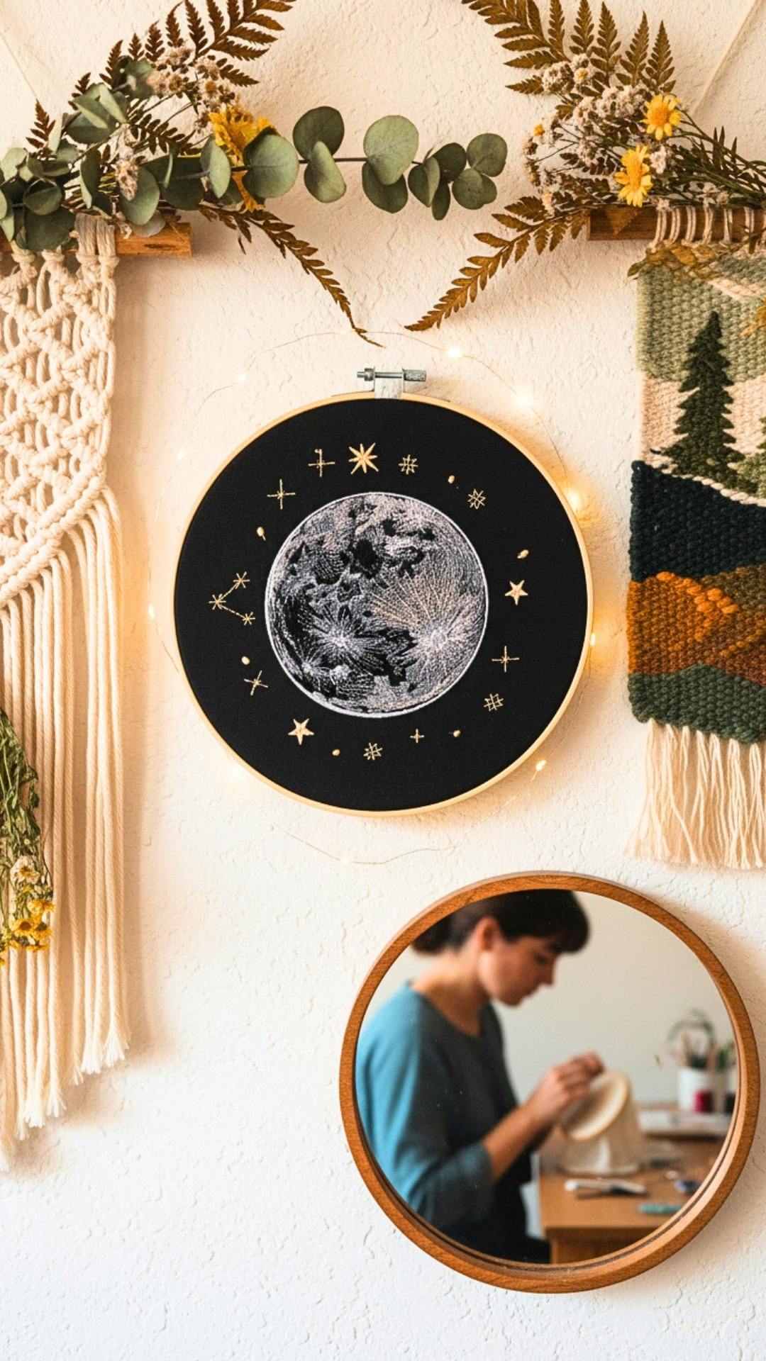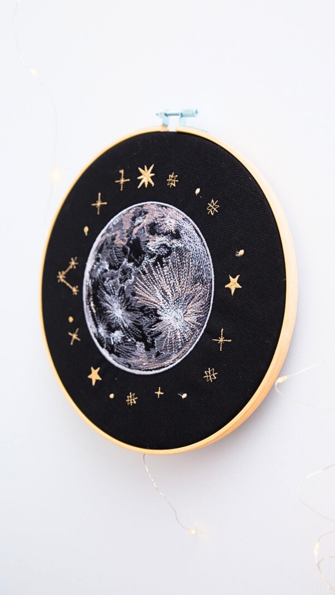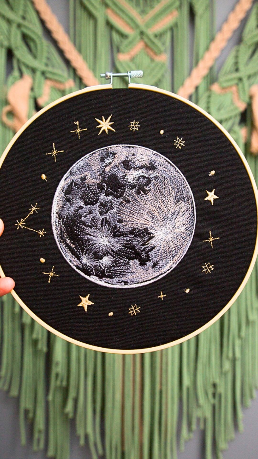 Złap księżyc w pełni i schowaj go w swoim wnętrzu. Niech ozdabia Twój dom i świeci dla Ciebie! Obraz prezentuje haftowany księżyc w pełni i otaczające go gwiazdy. Ozdoba cudownie prezentuje się w towarzystwie roślin oraz innych ozdób takich jak obrazy, makramy, tkane makatki. Jest bardzo oryginalną dekoracją, przyciągającą uwagę.