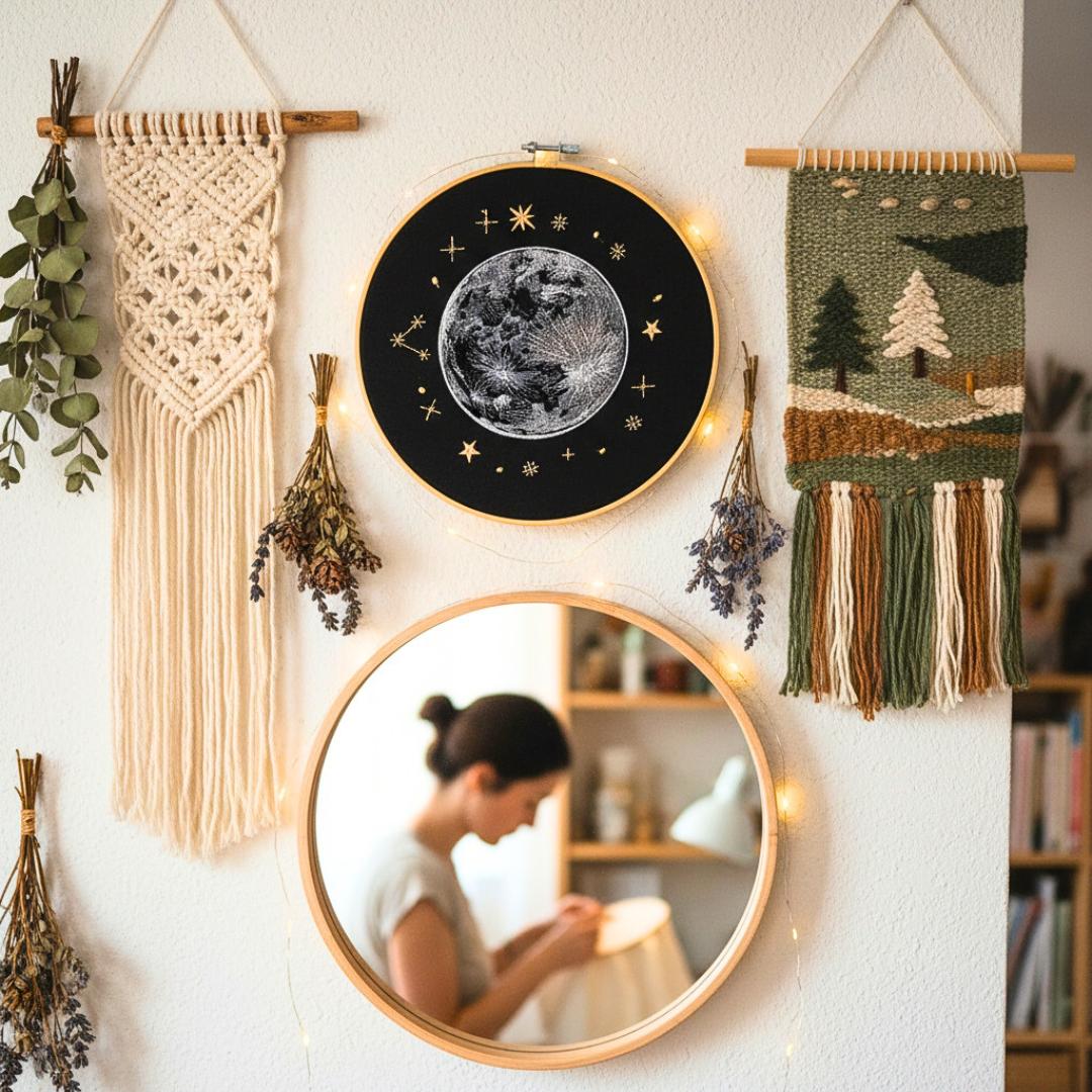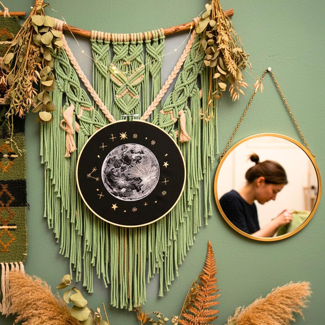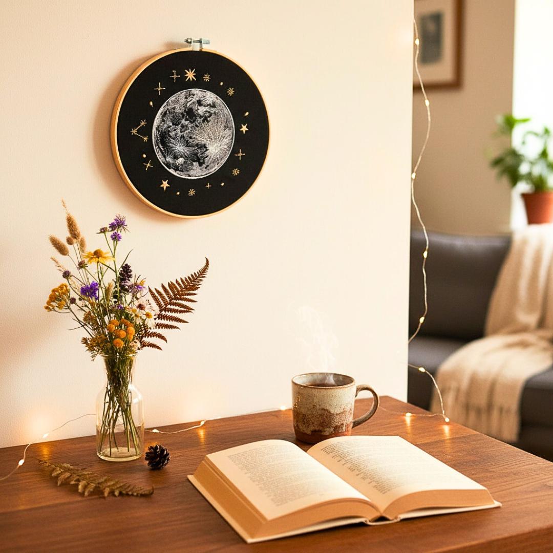 Złap księżyc w pełni i schowaj go w swoim wnętrzu. Niech ozdabia Twój dom i świeci dla Ciebie! Obraz prezentuje haftowany księżyc w pełni i otaczające go gwiazdy. Ozdoba cudownie prezentuje się w towarzystwie roślin oraz innych ozdób takich jak obrazy, makramy, tkane makatki. Jest bardzo oryginalną dekoracją, przyciągającą uwagę.