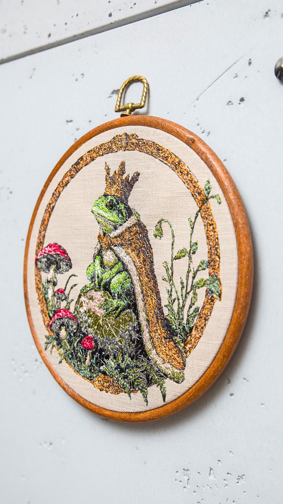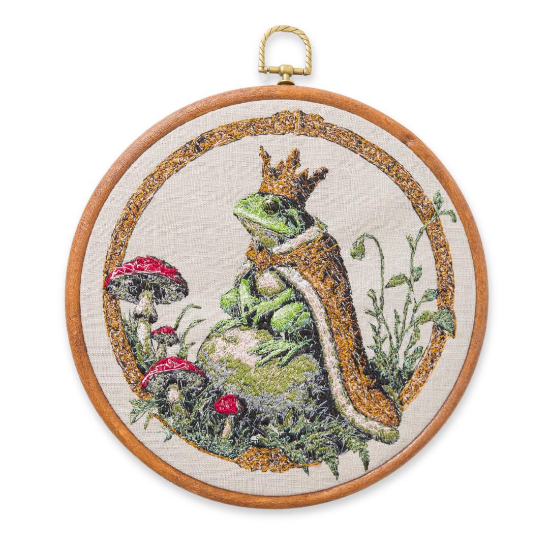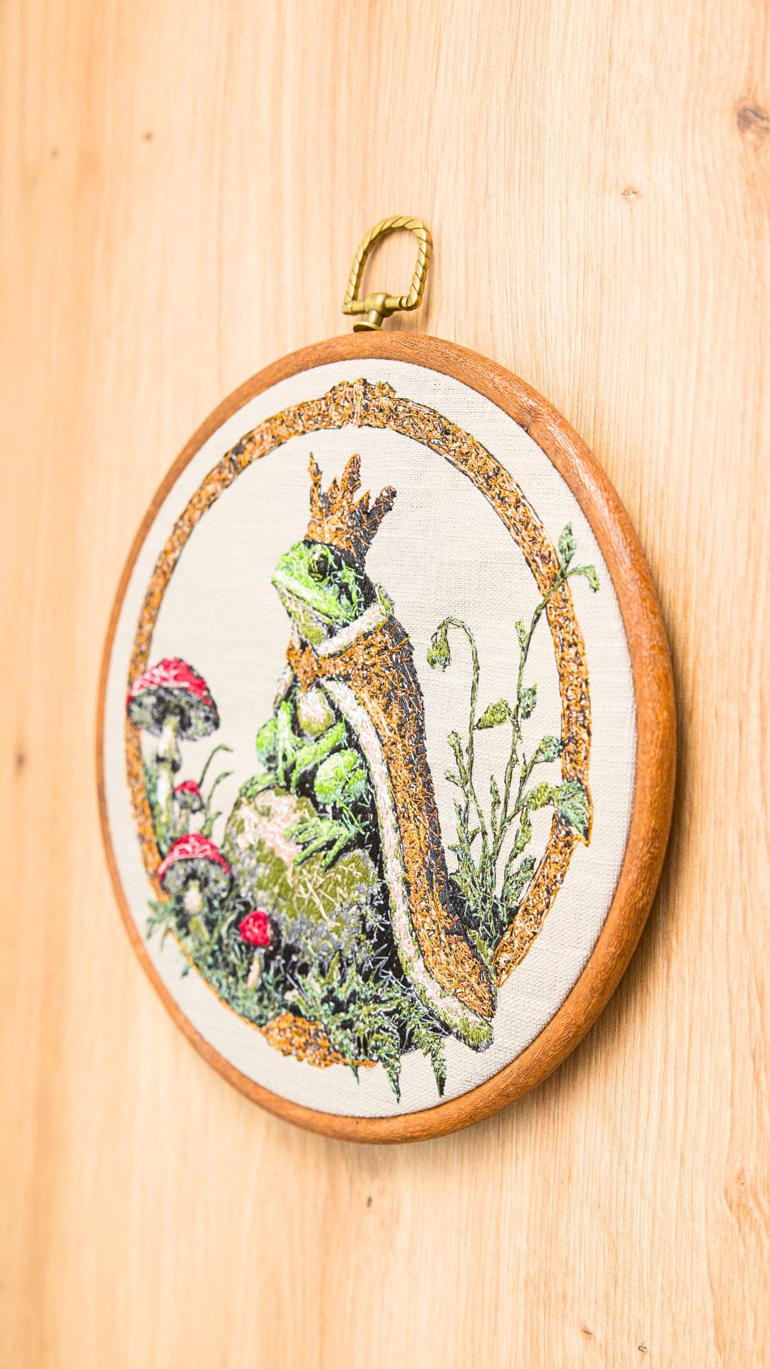 Haft przedstawia personifikowaną postać Żabiego Księcia. Haft w drewnianym tamborku lub oprawie vintage. Średnica 20 cm. Materiał bawełniany, nici hafciarskie.