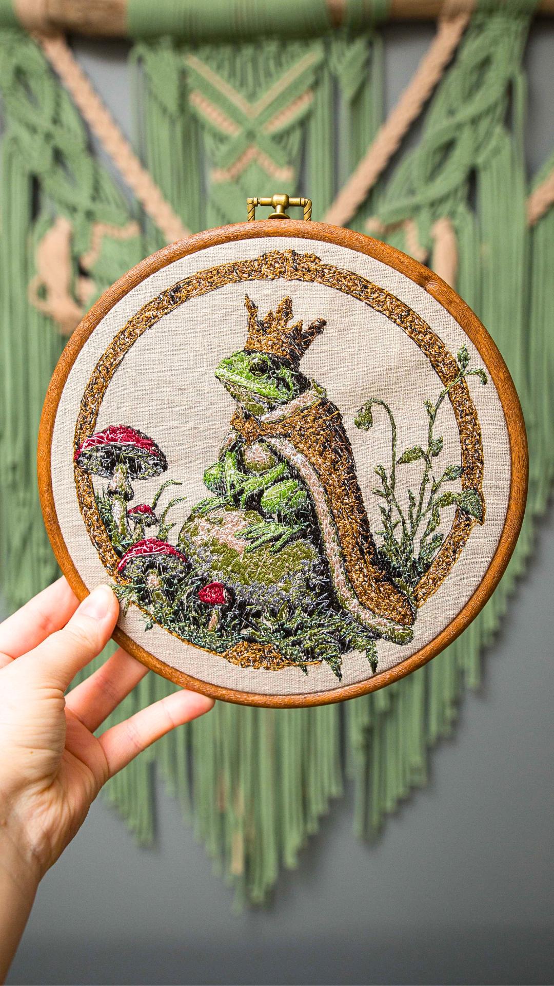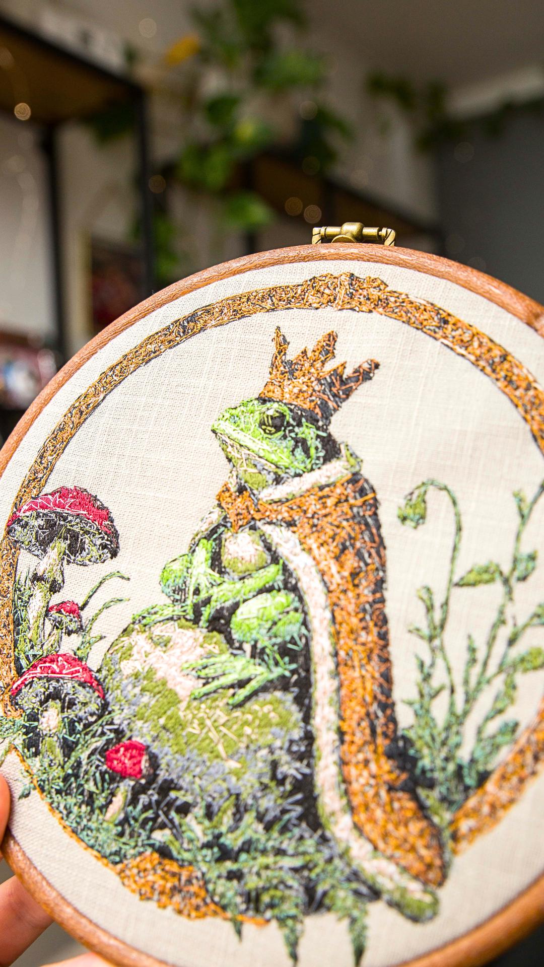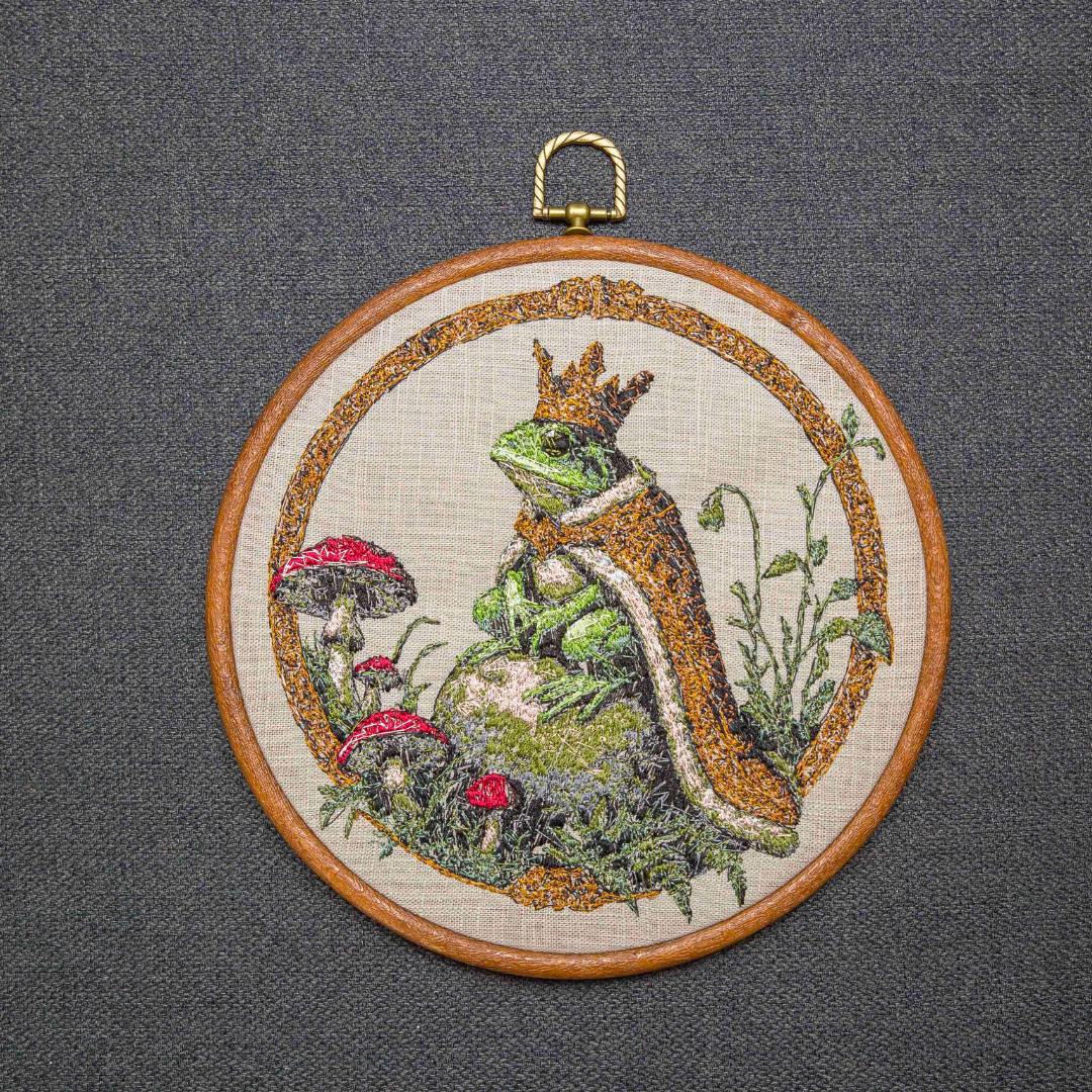Haft przedstawia personifikowaną postać Żabiego Księcia. Haft w drewnianym tamborku lub oprawie vintage. Średnica 20 cm. Materiał bawełniany, nici hafciarskie.